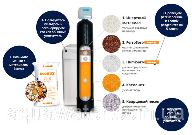Ecomix® A використовується в побутових та промислових фільтрах. Ecomix завантажується в фільтр у вигляді суміші, а вже при першій регенерації розділяється на п'ять шарів. Для регенерації використовується звичайна таблетована сіль.